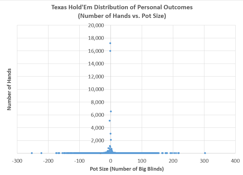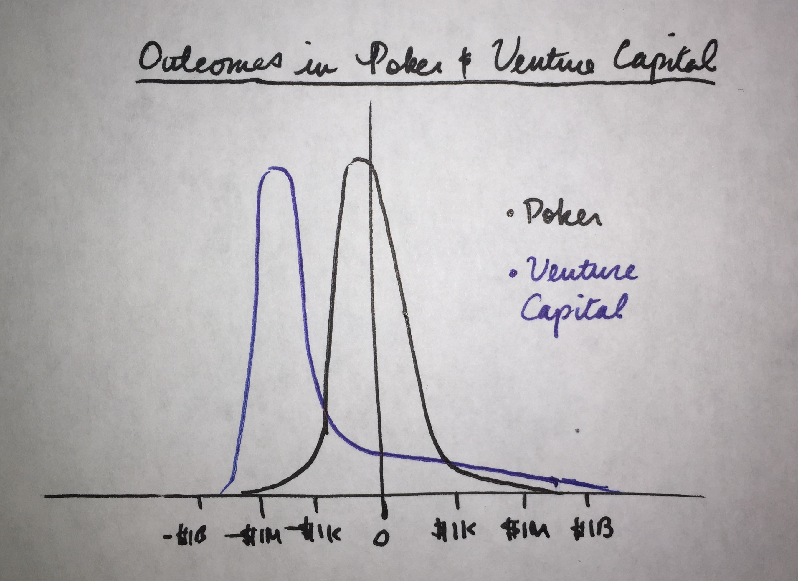 - Assumption: The Y axis is not drawn to scale. Professional poker players have hundreds of thousands of hands to draw from, while VCs might reach 100 investments over a very long career. If plotted on the same Y axis, the VC distribution would be barely visible, since there are so few actual investments
